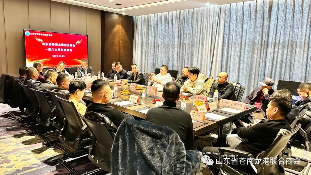 2023年11月29日下午,山东省苍南龙港联合商会一届八次常务理事会在济南市铂尔国际大酒店顺利召开。商会会长陈一江;名誉会长傅广伟、陈德放;监事长陈汉巢;执行会长兼秘书长林礼敏、黄磊、吴连笑;常务副会长陈德远、陈昌乐、郑志华、吴进加;副会长兼副秘书长陈伟武、杨乃赠、陈慧恩、杨连明、陈重阳、陈相树、黄开票、赵兴貌;理事吴高强、陈明勇及秘书处成员共22人参加了本次会议。会议由陈一江会长主持。